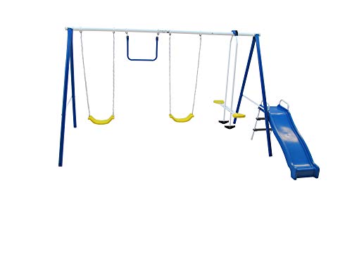 This Backyard Discovery Belmont swing set features a covered play deck an 8 slide two belt-swings with kid-friendly chains and an incredibly fun trapeze acrobat bar. A swing set made for an 8-year-old could pose a danger to a toddler. The metal frame supports one plastic swing seat held up by ropes and its recommended for kids ages 3 to 8 as it has a 99 pound weight limit.